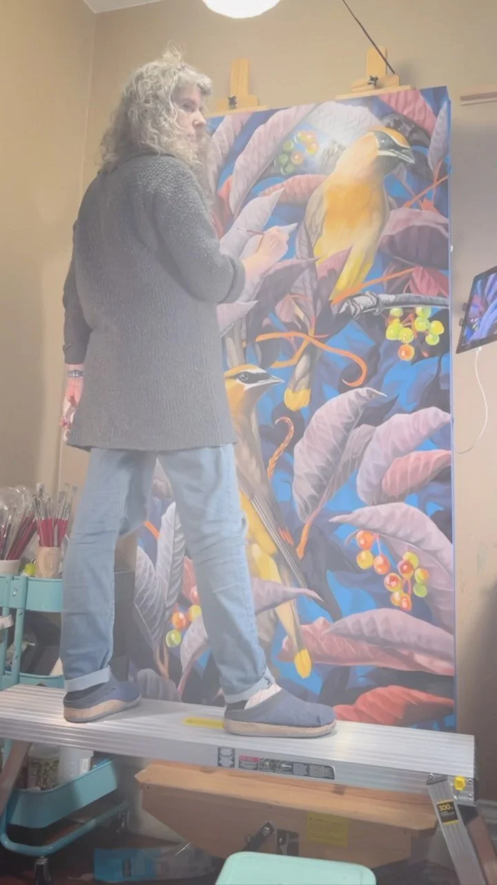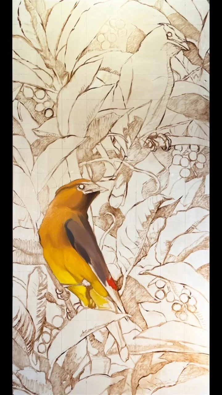 Each work is made from multiple layers of vitreous enamel kiln-fired onto steel and copper which I have cut, hammered or bent by hand. Annealed or coated copper wire joins individual panels. Wall pieces are suspended from salvaged copper pipe wrapped in copper wire, or from salvaged wood treated with either oil or a fire-and-wax technique. “Birdcage” chimes hang from my hand-hammered copper bowls. I cut and tune my own chimes from copper pipe, and make strikers from leftover scraps of Brazilian Walnut (Ipe). Bowls are hand-cut and hand-hammered from 18-gauge sheet copper, and, like my other works, require several separately fired layers of enamel with sgraffito, drawing, and color mixing techniques which render each piece unique.