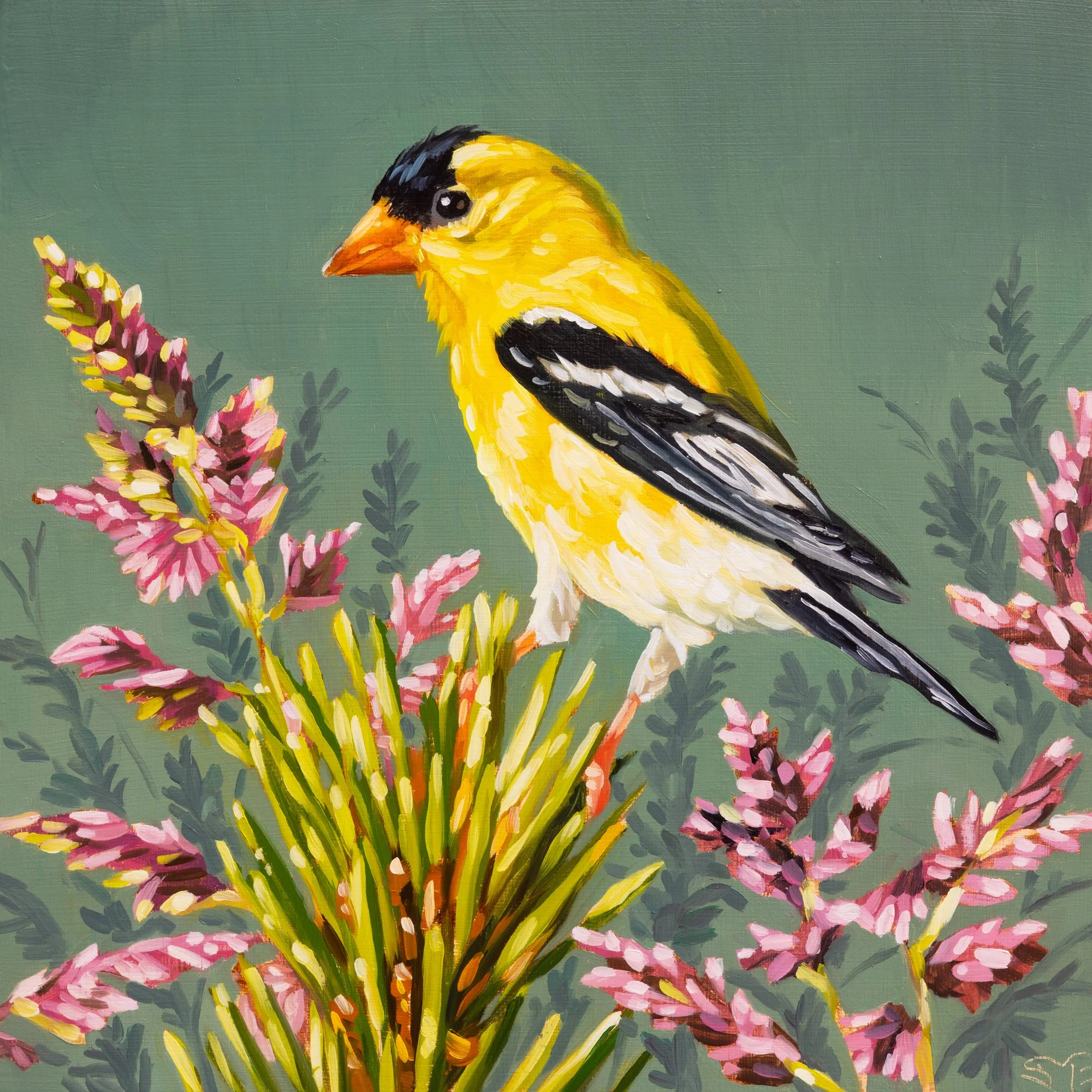 Left: Goldfinch, Canarygrass. Oil on cradled wooden panel, 10” x 10”